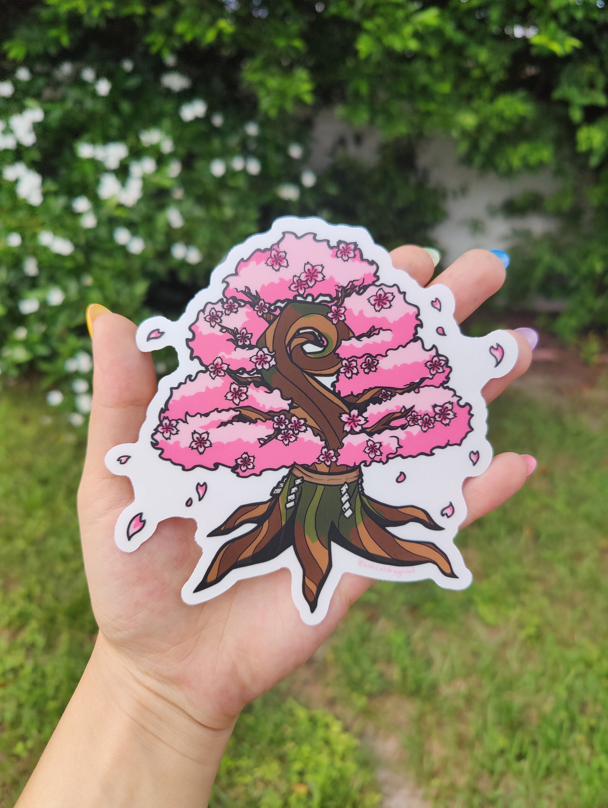 This sticker depicts a beautiful cherry blossom guardian sapling on a clear background.